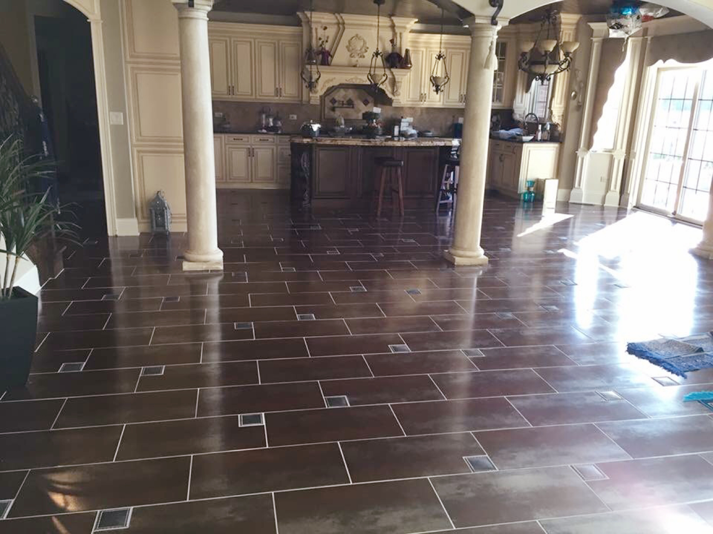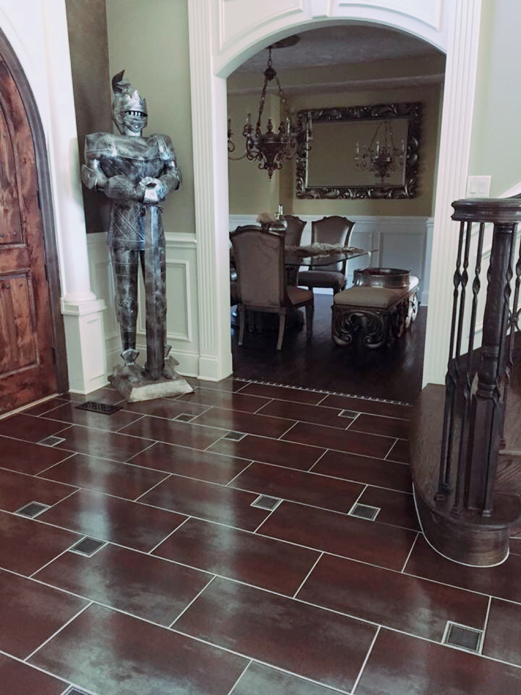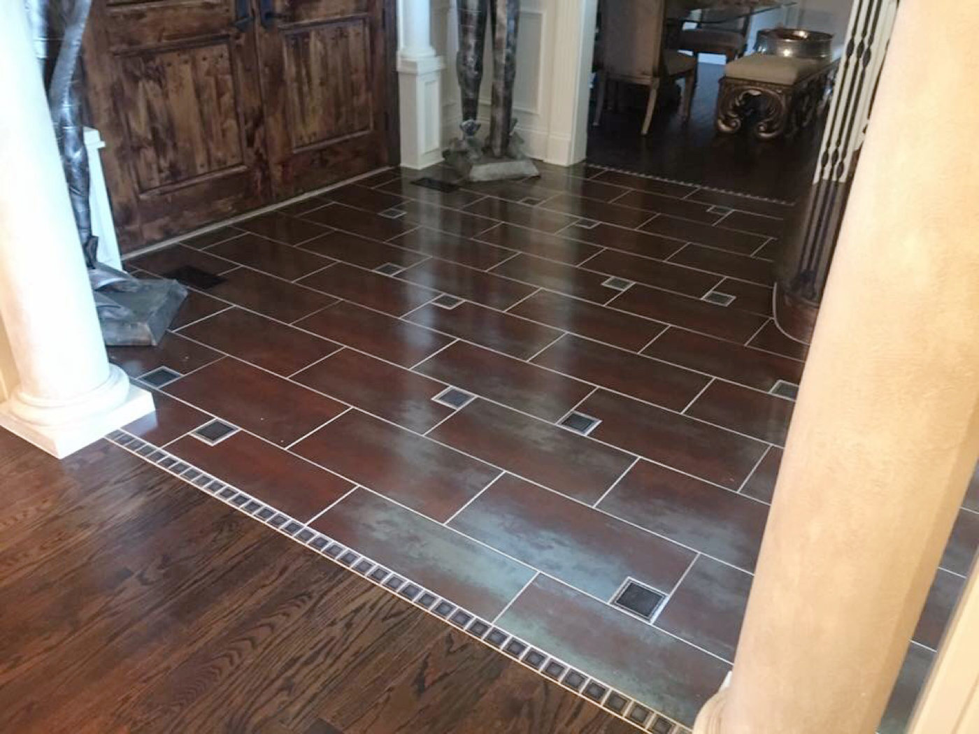 Our Customer requested a custom tile design to incorporate their Middle Eastern aesthetic and existing color palette and decor. After working with them and getting to know them, we created a beautiful floor design that spanned their entire first floor, beginning from the foyer and flowing into their living room and kitchen.